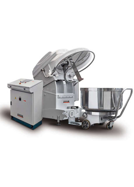 The mixers of the SUPER PREMIUM line are equipped with a spiral and a removable bowl that rotates through a gear. and will allow you to achieve great refining and oxygenation. The mixer is powered by a belt drive with double transmission and by a motor, controlled by an inverter, that allows you to customize the revolution speed of the tools. The bowl is driven by a plastic gear connected to a crown gear underneath the bowl and fixed to it, thus ensuring the equipment is quiet and resistant. This mechanism rotates the bowl even if there is fat and oily material on the edges. Also in this case, an inverter drives the motor that activates the gear, allowing you to customise the bowl revolution speed and its reversal.